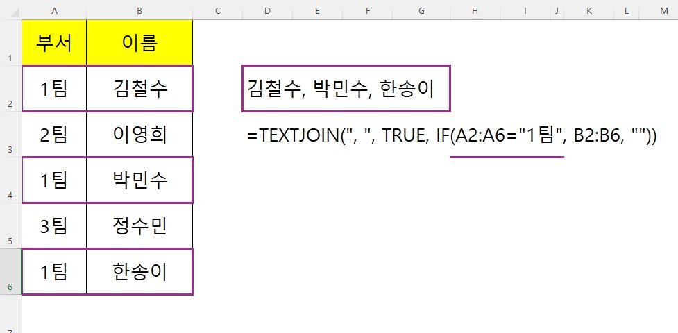 그 결과를 TEXTJOIN이 받아서, TRUE(빈칸 무시) 옵션 덕분에 빈칸은 다 버리고 1팀 사람들의 이름만 콤마로 예쁘게 묶어주는 것이죠.