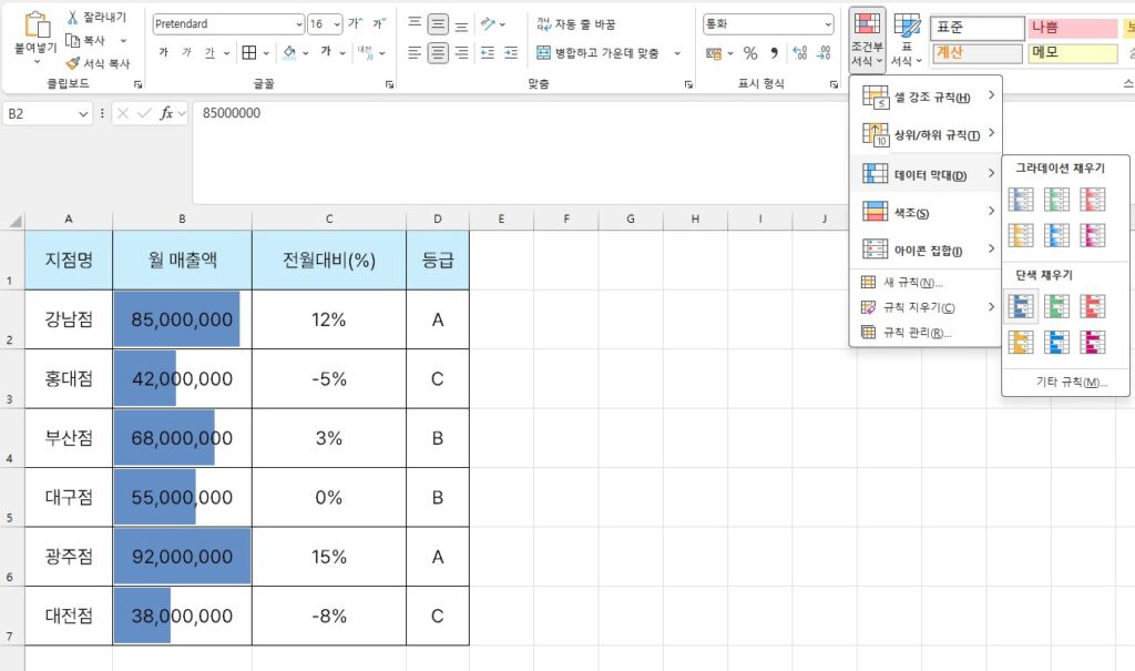 - 사용법: 데이터를 드래그 → [홈] 탭 → [조건부 서식] → [데이터 막대] 클릭.