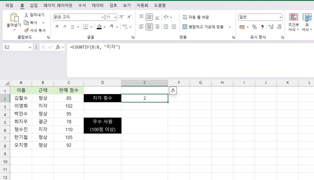 아주 간단하죠? 여기서 가장 중요한 포인트는 큰따옴표(“”)입니다. 엑셀 수식에서 텍스트(문자)를 조건으로 넣을 때는 반드시 양쪽에 큰따옴표를 붙여줘야 합니다. 만약 =COUNTIF(A2:A10, 지각)이라고 쓰면 엑셀은 이를 인식하지 못하고 에러를 뱉거나 0을 반환합니다.
