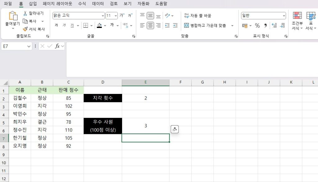 가장 많이 쓰는 기능입니다. 직원들의 출근 기록부에서 “지각”이나 “결근”한 횟수를 자동으로 집계해 보겠습니다.