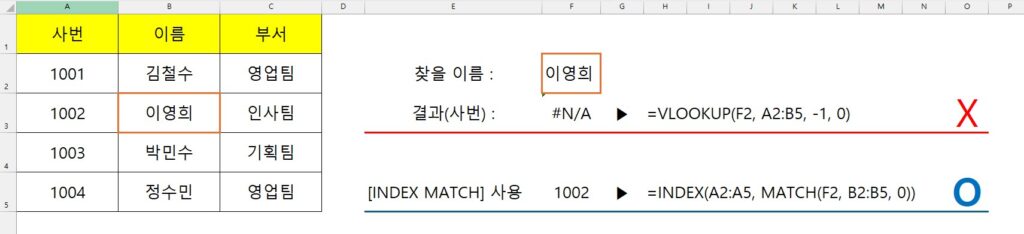 가장 흔한 상황입니다. B열에 ‘이름’, A열에 ‘사번’이 있습니다. 우리는 이름을 가지고 사번을 찾고 싶습니다. 기준(이름)보다 결과(사번)가 왼쪽에 있죠? VLOOKUP은 여기서 작동하지 않습니다.