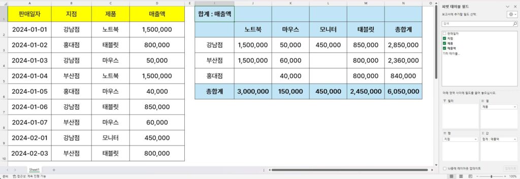 어떤가요? 단 3번의 드래그로 가로세로 완벽하게 정리된 표가 만들어졌습니다. 만약 “제품별로 먼저 보고 싶어”라고 생각이 바뀌면? 그냥 [행]과 [열]에 있는 필드를 서로 바꿔주기만 하면 됩니다. 1초도 안 걸리죠.